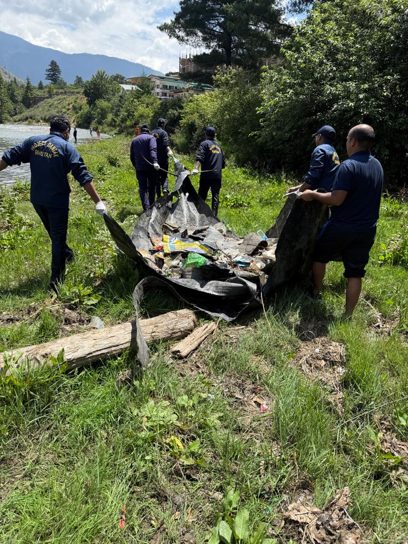 Together, they cleaned the stretch of the Wangchu River between Depsizam and Ramazam, collecting two full truckloads of black plastic waste once again originating from the Babesa sewage treatment plant.